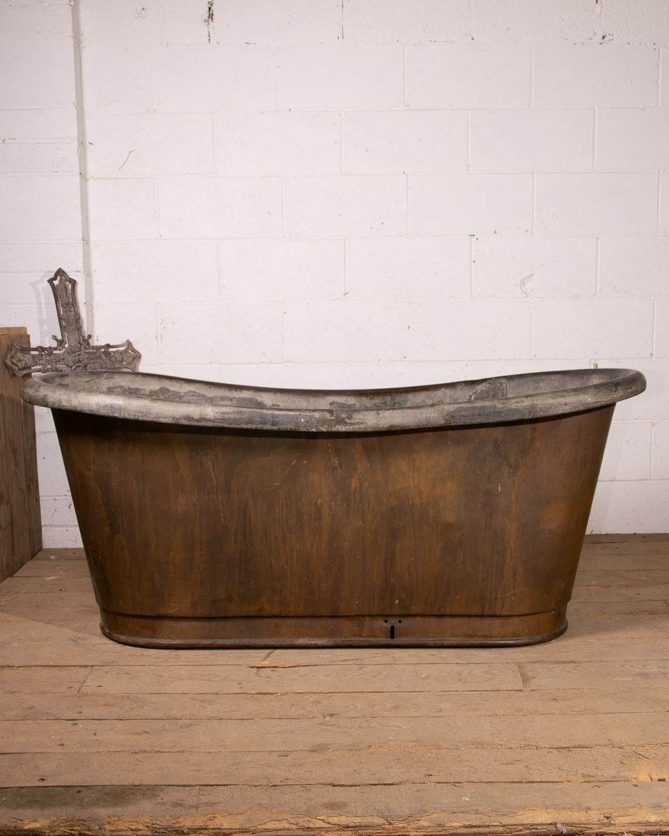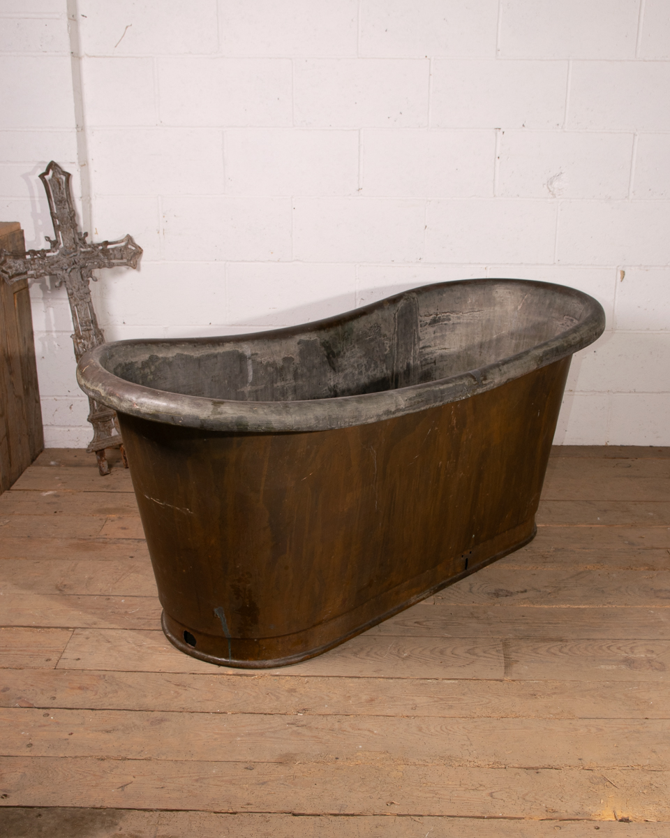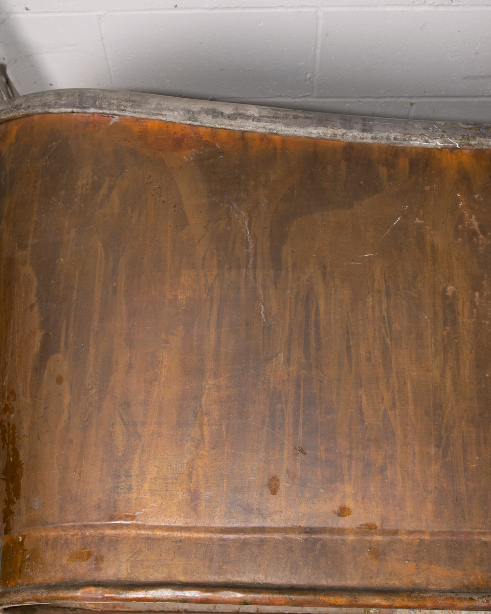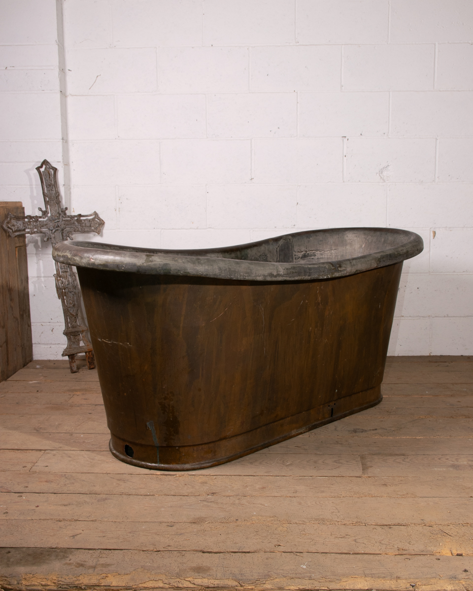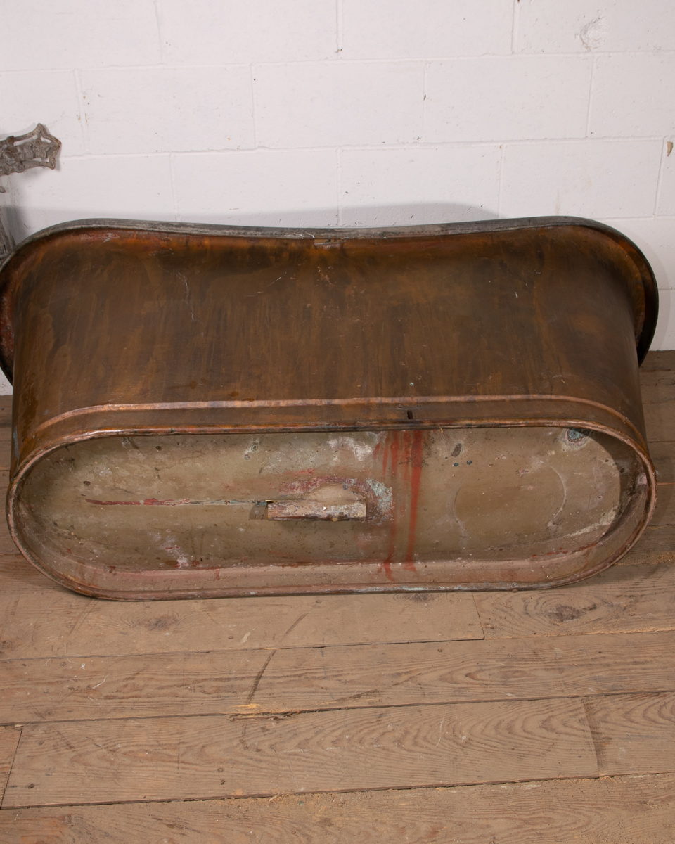 An mid 19th century symmetrical copper rolltop freestanding bathtub. Tin electroplate interior and patinated copper exterior