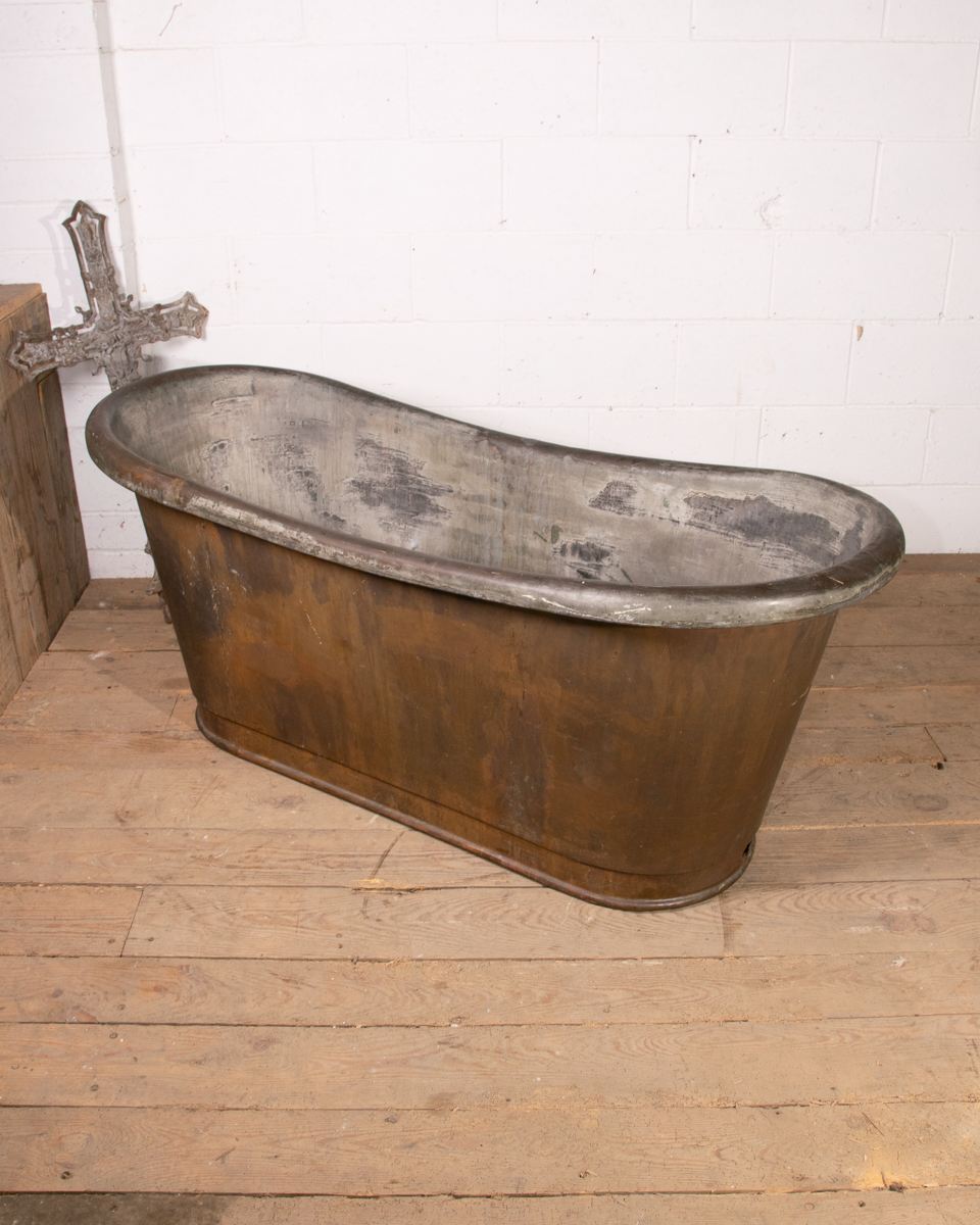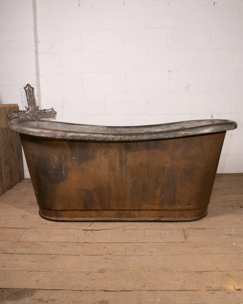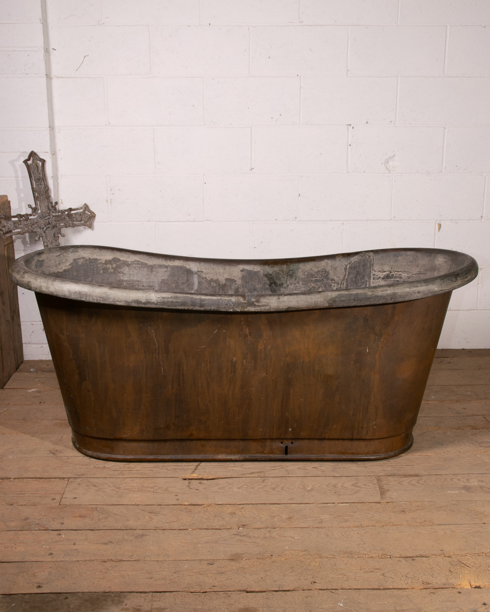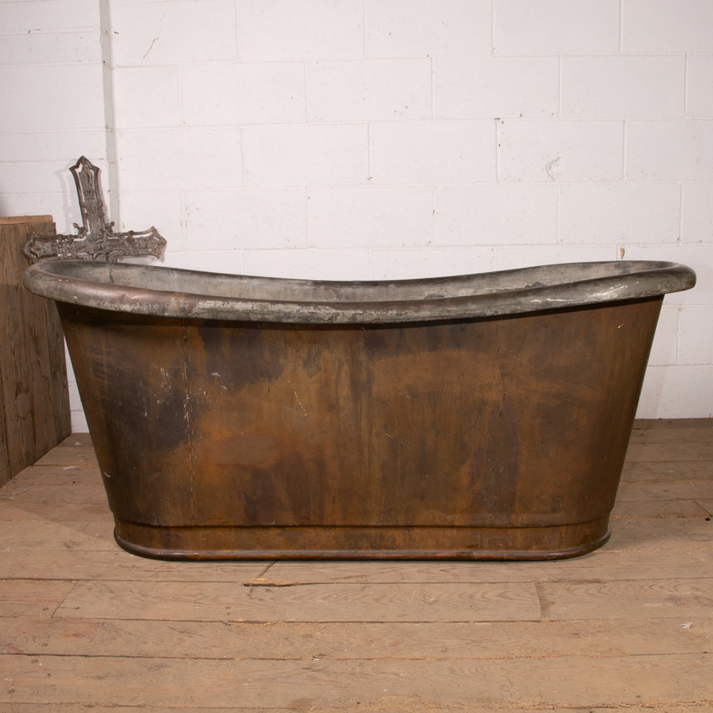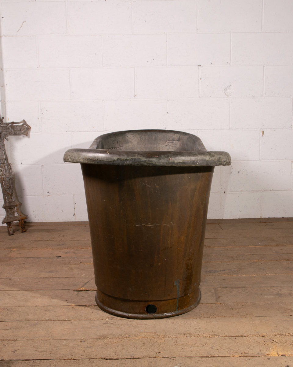 An mid 19th century symmetrical copper rolltop freestanding bathtub. Tin electroplate interior and patinated copper exterior