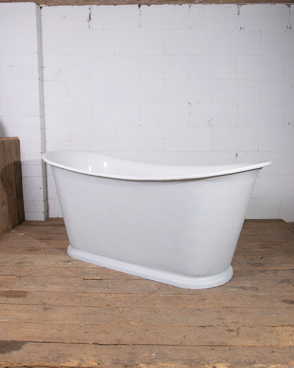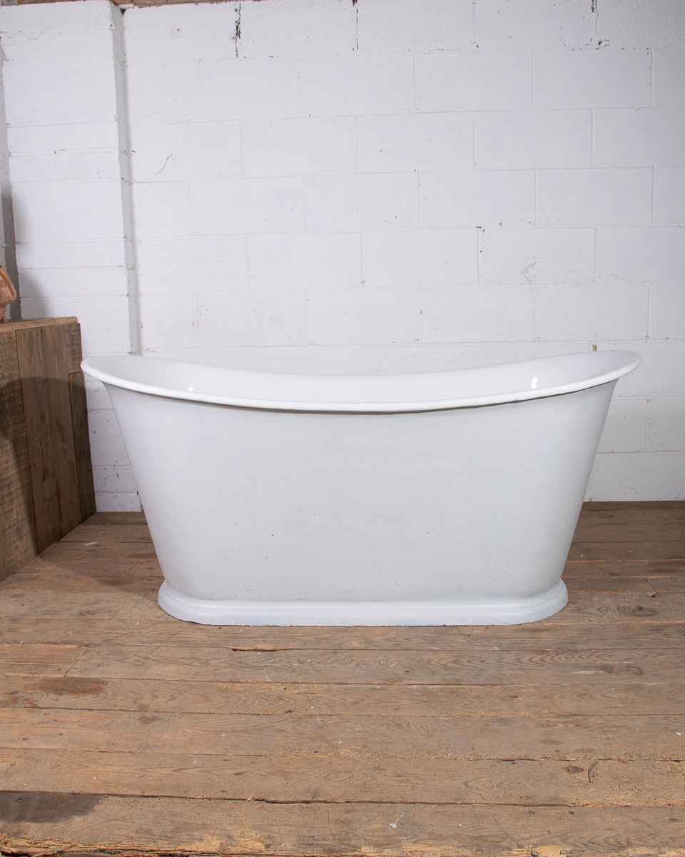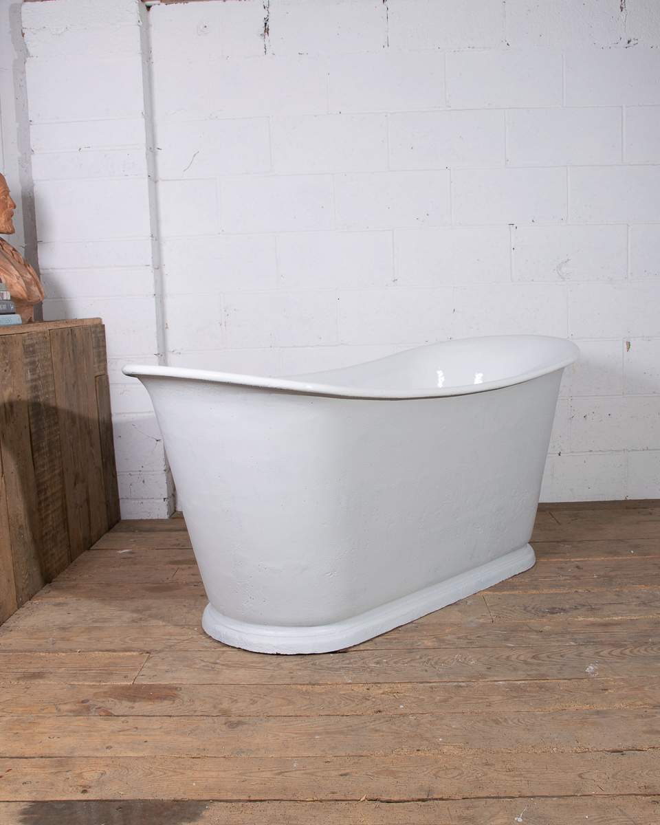 A beautifully shaped cast iron empire bathtub on a plinth from around 1880. The tub has just been refurbished including resurfaced enamel and blasted and primed exterior.