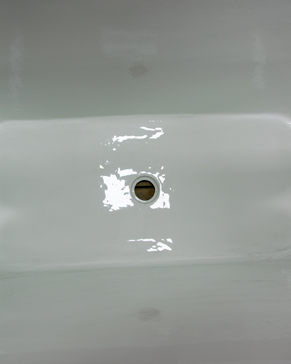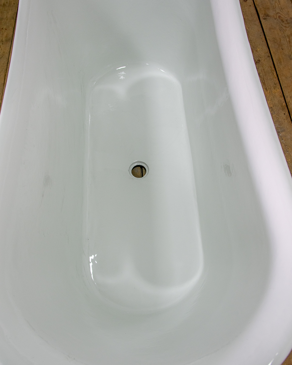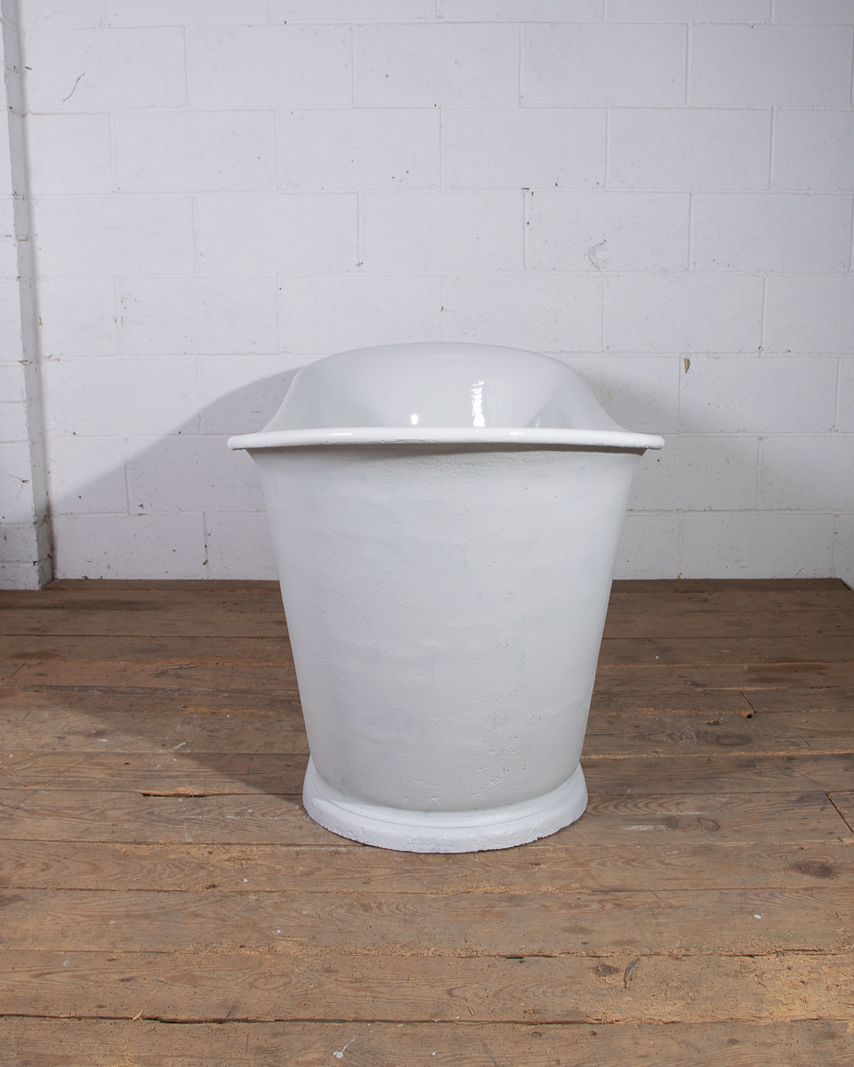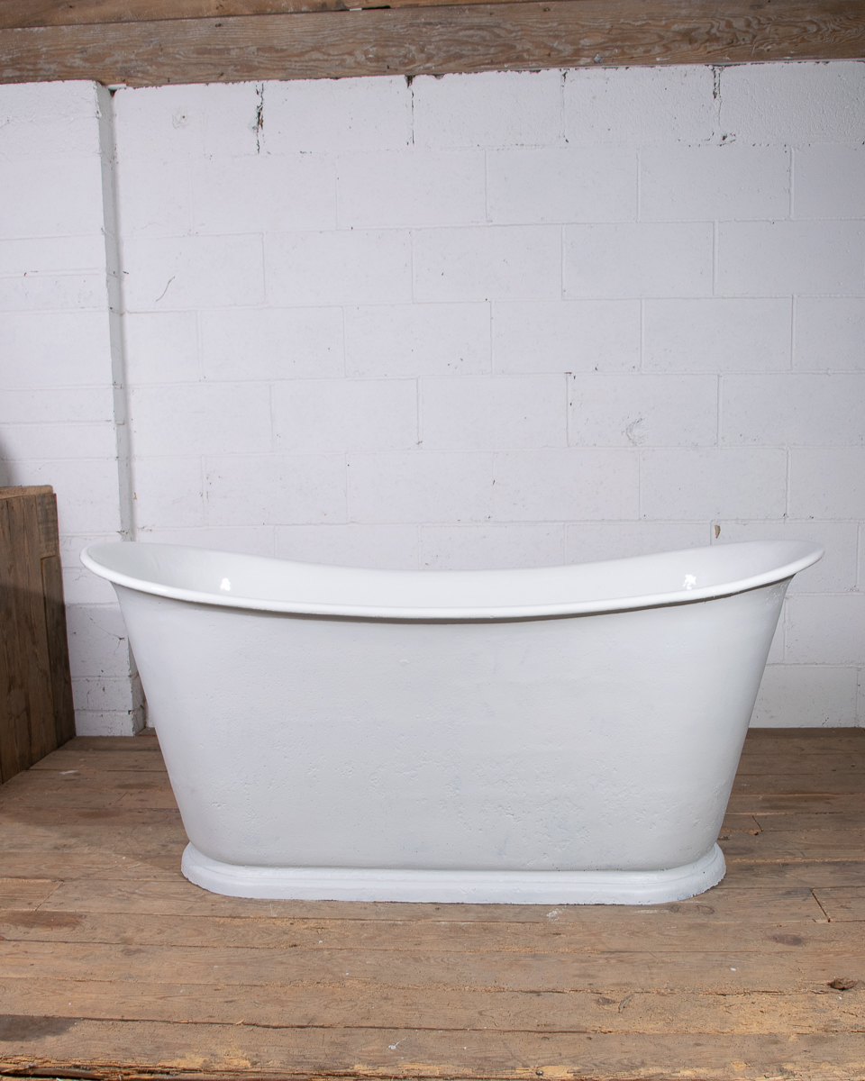 A beautifully shaped cast iron empire bathtub on a plinth from around 1880. The tub has just been refurbished including resurfaced enamel and blasted and primed exterior.